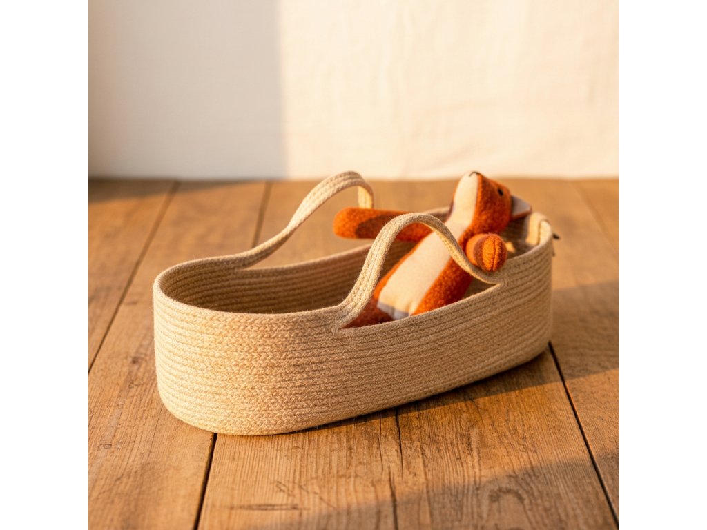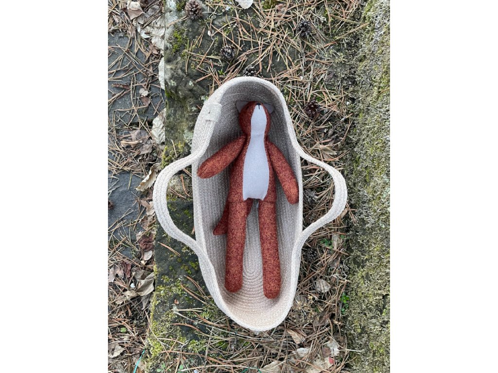 V tomto setu jsme pro vás k postavičce zvířátka udělali košík - pelíšek. Košík je ušitý z vyztužené bavlněné šňůrky. Jeho rozměr je 37-40 x 17 x 10 cm. Je pevný a lze ho použít i jako úložný obal pro drobné hračky, pletení, drobnosti v koupelně a podobně.